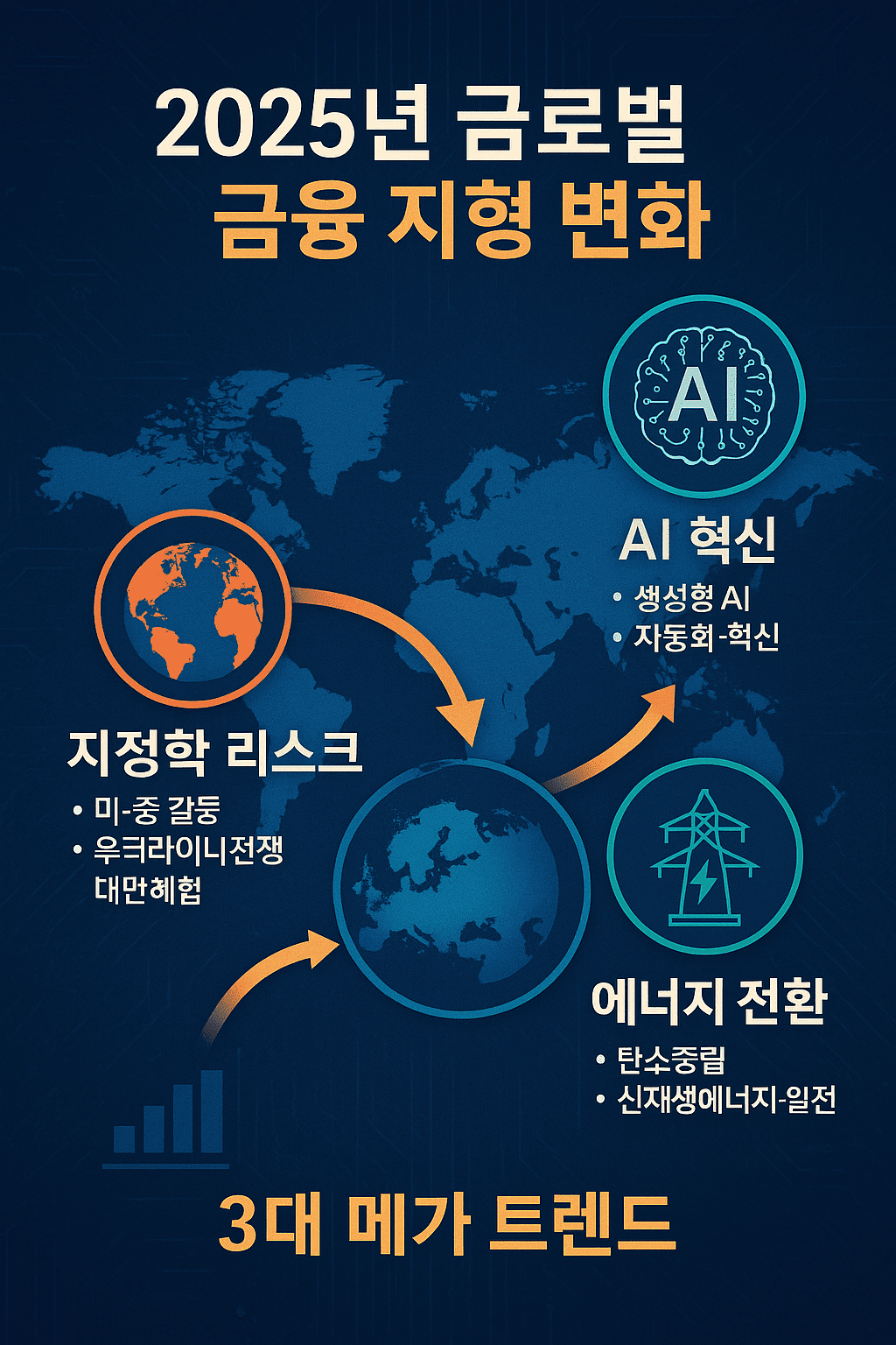 2025년 글로벌 금융시장에 미칠 3대 메가트렌드: 지정학, AI 기술혁신, 에너지 전환. 투자자들이 대비해야 할 전략과 핵심 산업을 분석한 고급 인사이트.
